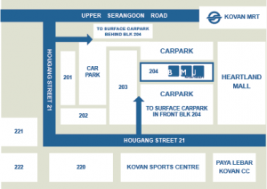 Take the North East line and alight at NE13 Kovan station Exit C. 2 min walk via Heartland mall.
